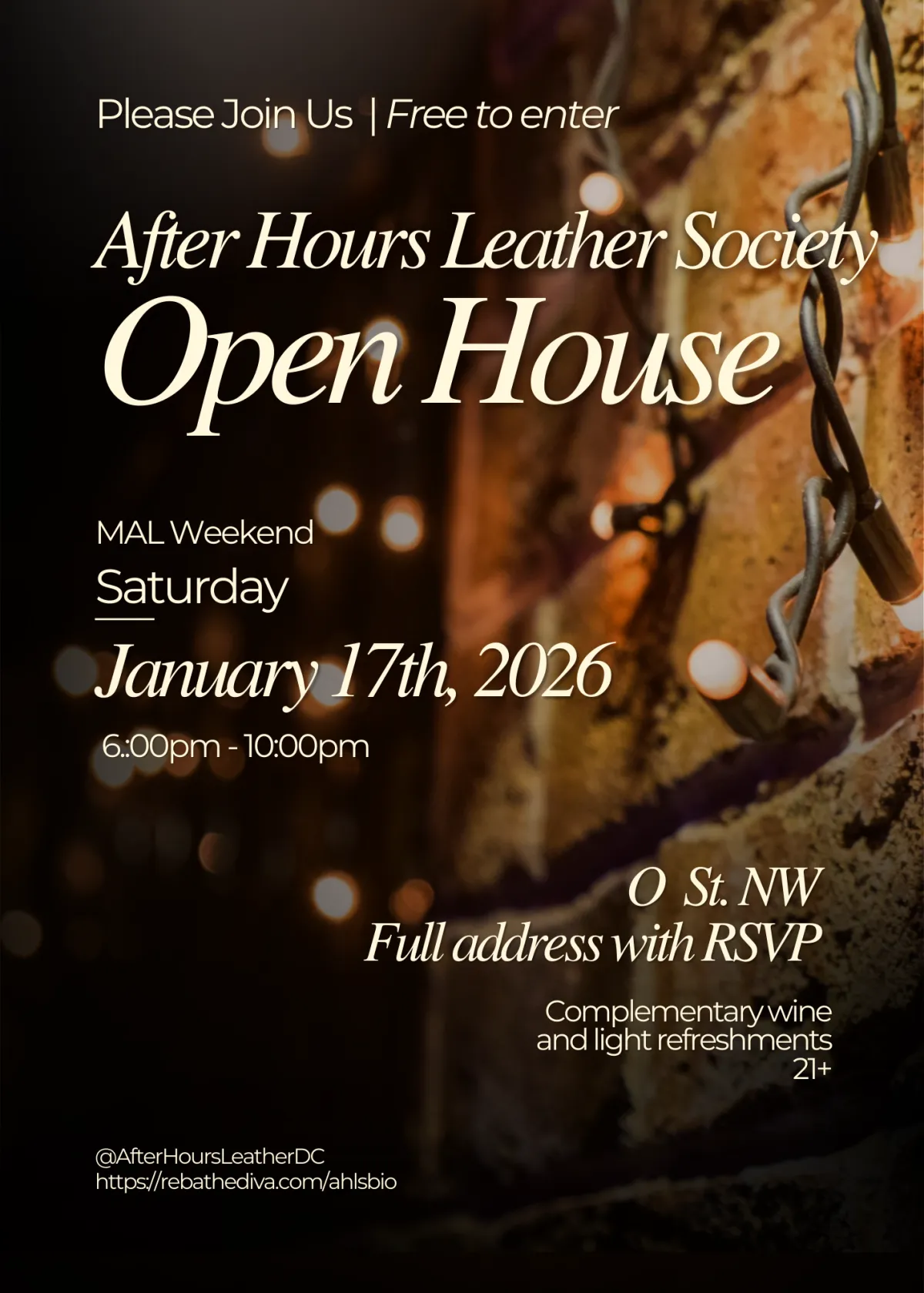 Curious about the After Hours Leather Society? Come get to know us at our FREE open house for Mid-Atlantic Leather weekend!